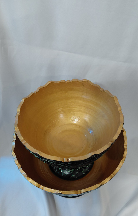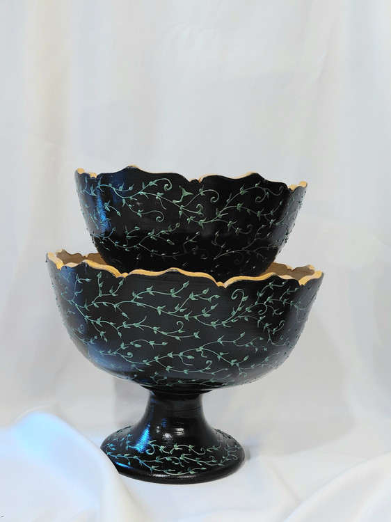 سایز بزرگ به عنوان میوه خوری ارتفاع ۱۹قطر دهانه ۲۵ و سایز کوچک به عنوان آجیل یا شکلات خوری ارتفاع ۱۷ قطر ۲۰ سانت.کلا کار دست هست و طرح برجسته