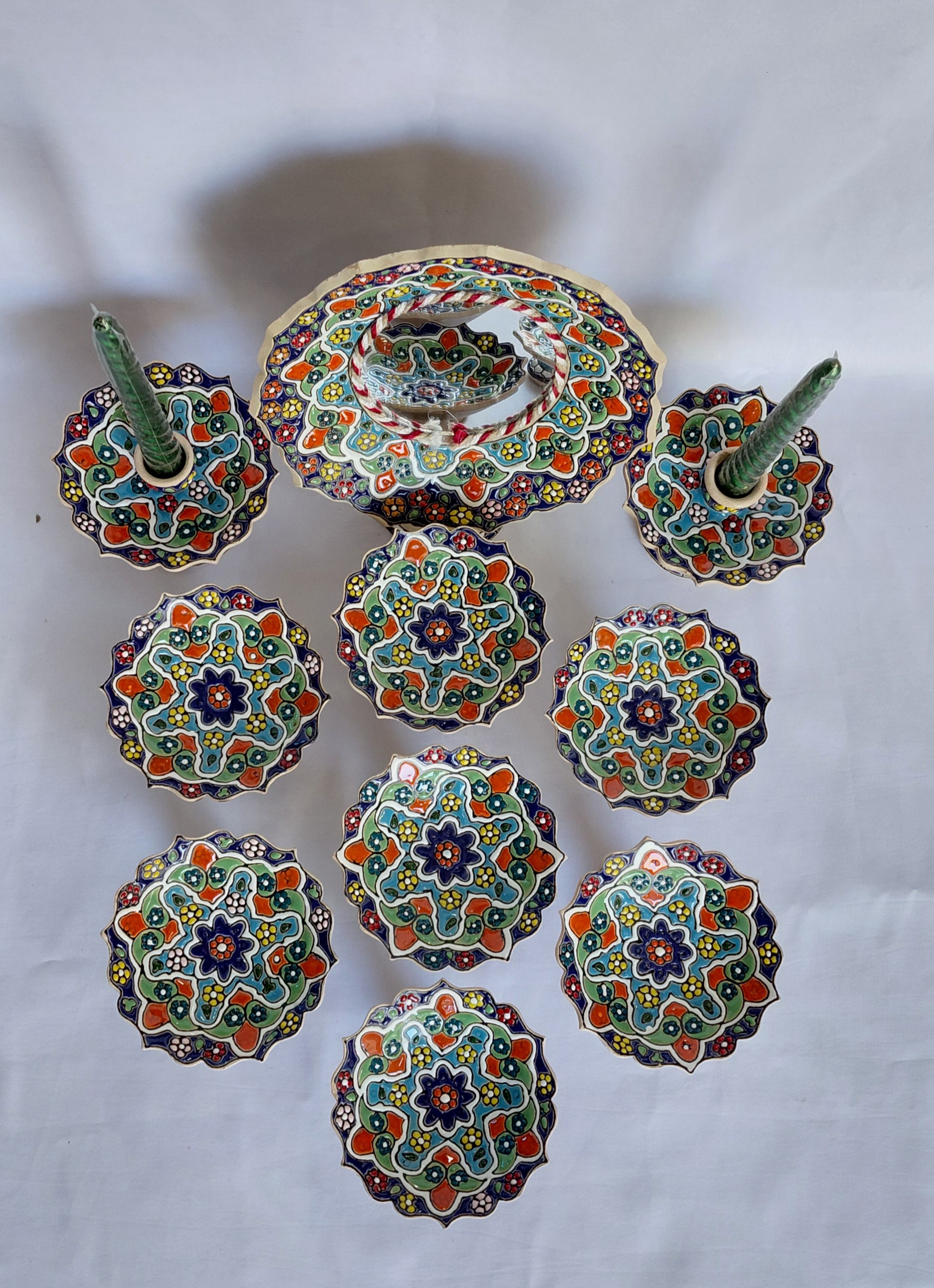 هفت سین میناکاری ۱۰ تیکه مدل بشقاب کمانی پایه دار قابل شستشو و تهیه شده از تولید و عرضه به قیمت مناسب