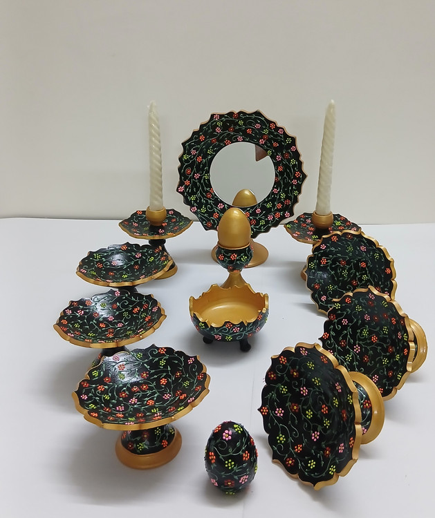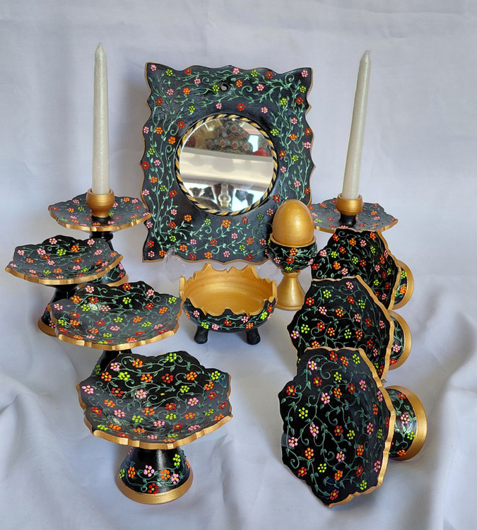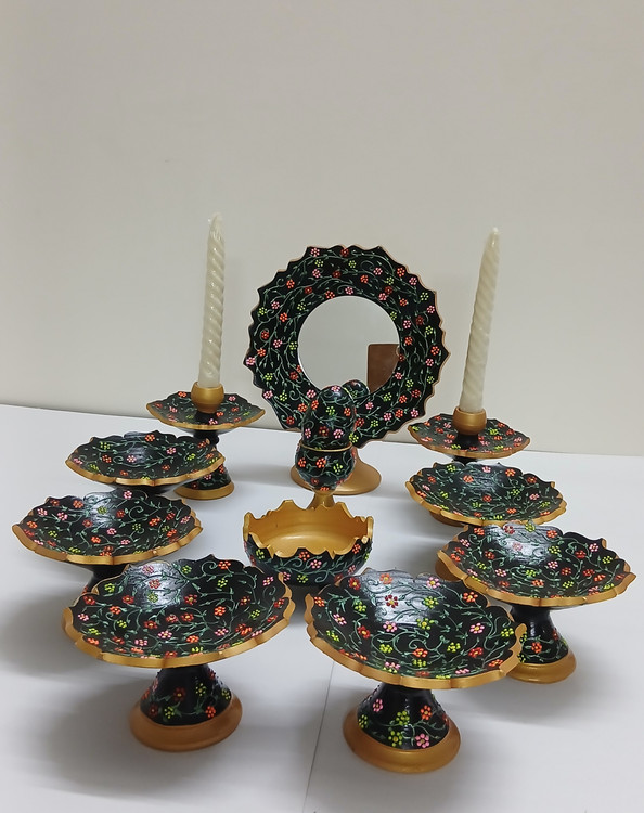 هفت سین سفالی مدل کاسه کمانی پایه دار طرح باغ بهشت