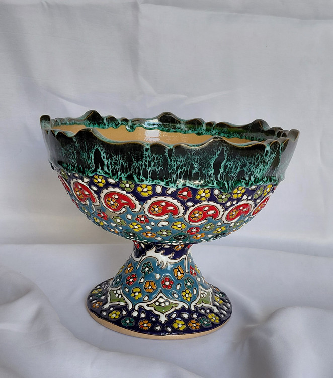 میوه لبه اشکی مینا کاری ارتفاع ۱۹ قطر ۲۳ جنس سفال داخل کار کرم
