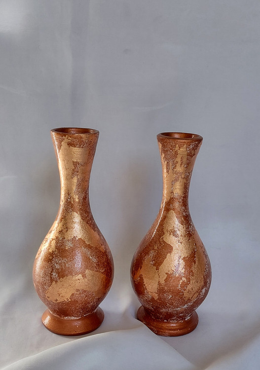 گلدان سفالی با رنگ اکرلیک کار شده.طرح روی کار از ورق طلا و پتینه ادغام شده و ارتفاع ۲۰ سانت.نوع دیگر این کار گلدان شاهرضایی ۳۰ سانتی طرح پتینه و ورق طلا میباشد
