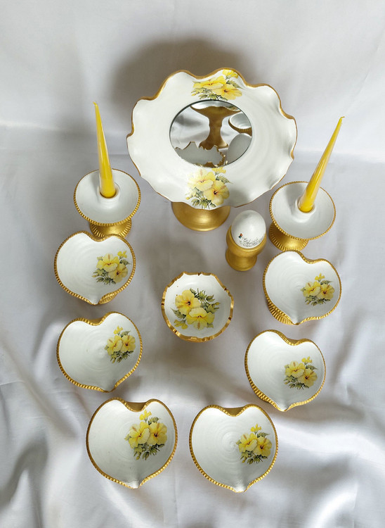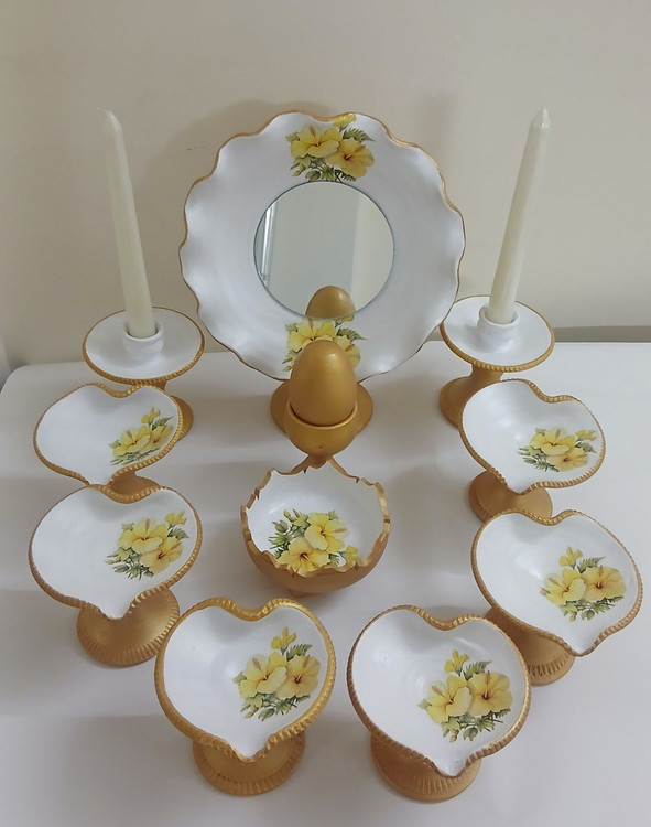 هفت سین مدل قلب، کار شده با رنگ اکرلیک و ترنسفر یکی از زیباترین کارهای امسال هست.۱۱ تیکه شامل آینه و ۲ جا شمعی و ۶ سین و یک جا سبزه و یک تخم مرغ با پایه