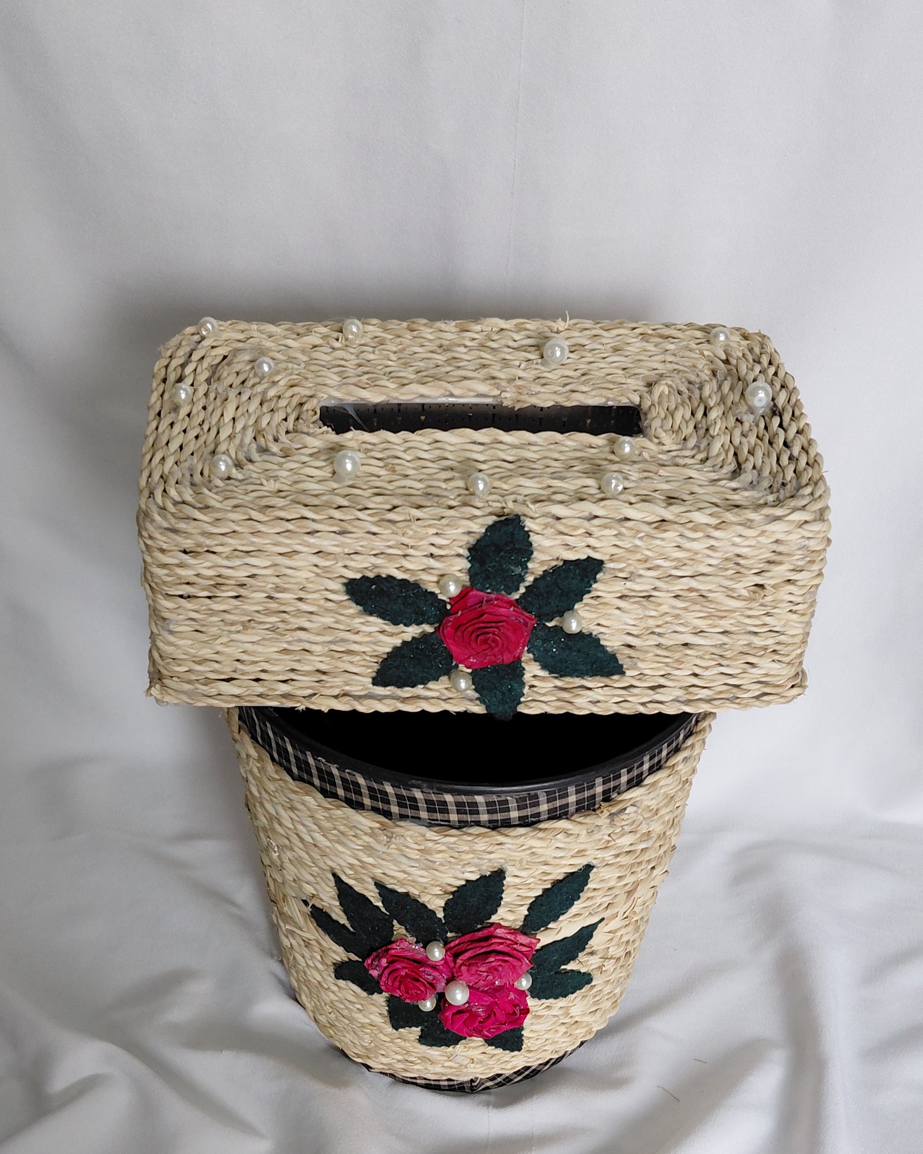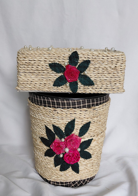 ست سطل آشغال و جا دستمال کاغذی که جنس اصلی کار از نوع پلاستیک کاملا محکم و فشرده هست و روی کار با حسیر به زیبایی تزئین شده .ارتفاع سطل آشغال ۲۵ و قطر ۲۱ طول جا دستمالی ۲۴ عرض ۱۳ و ارتفاع ۹ سانت