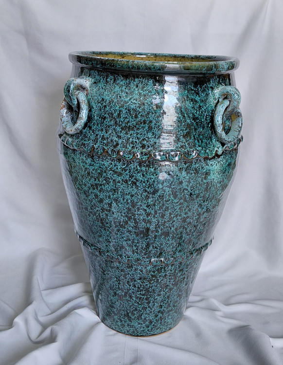 گلدان ۴ دسته اشکی سفالی ارتفاع حدودا ۵۰ و قطر دهانه ۲۸ سانت بیرون کار لعاب شده و کاملا قابل شستشو هست داخل کار هم ضد آب شده و شما میتونید حتی گل یا درختچه طبیعی بکارید