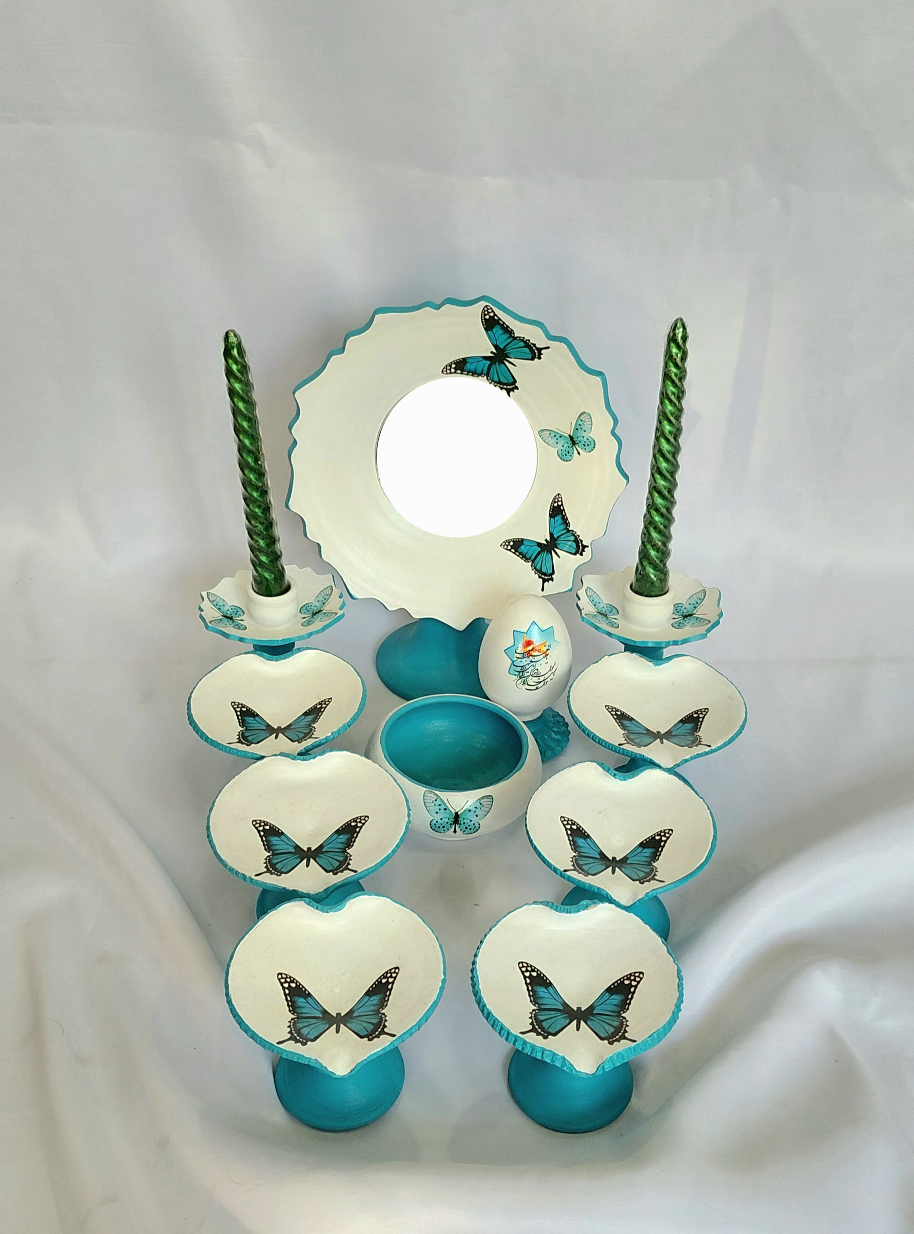 هفت سین تک پایه مدل قلب طرح ترنسفر پروانه ۱۱ تیکه رنگ شده با بهترین نوع رنگ اکرلیک.شامل ۱ آینه ۲ جا شمعی ۱ جاسبزه ۶ سین و یک تخم مرغ با پایه.قابل شستشو کار دست اول و طرح و رنگ خودمونه و با پایین ترین قیمت ممکن تقدیم شما میشه.طرح های دیگه هفت سین های ترنسفر رو هم از بخش هفت سین میتونید مشاهده کنید