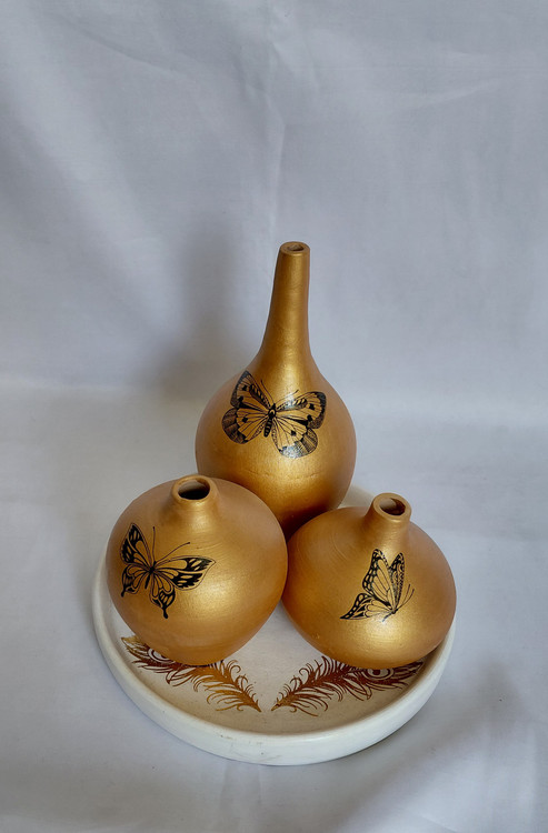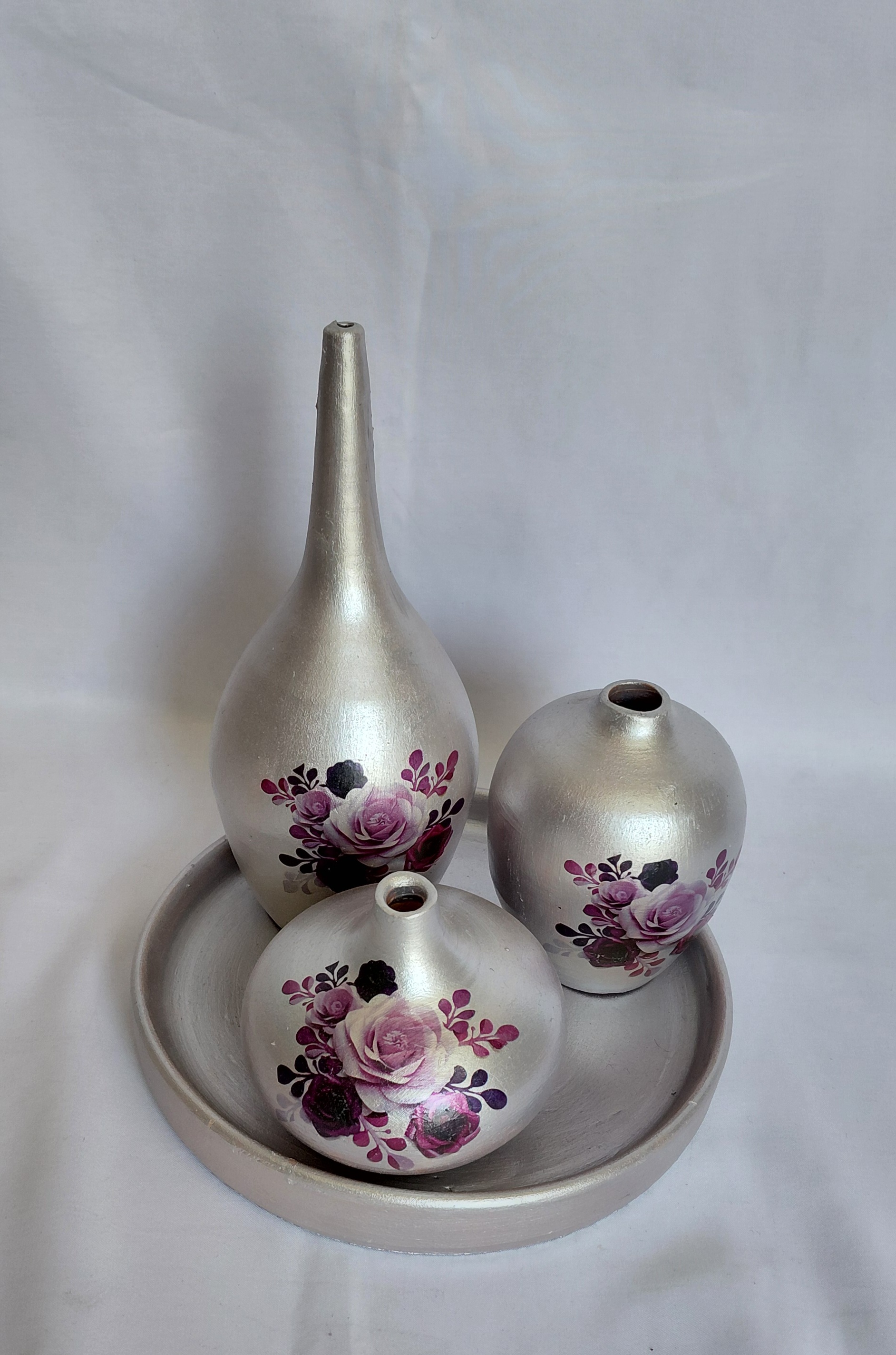 ست سینی سالنگ قطر سینی ۱۹ سانت،ارتفاع ۳ تیکه داخل سینی به ترتیب از کوچک ۹ و ۱۰/۵ و ۱۹ سانت.قابل شستشو.به عنوان جلو مبلی و یا داخل ویترین کاربرد دارد و زیبایی خاصی به فضای داخل خونه میبخشه